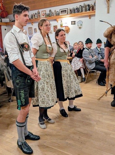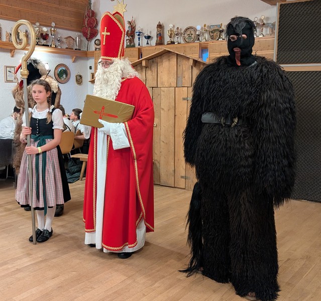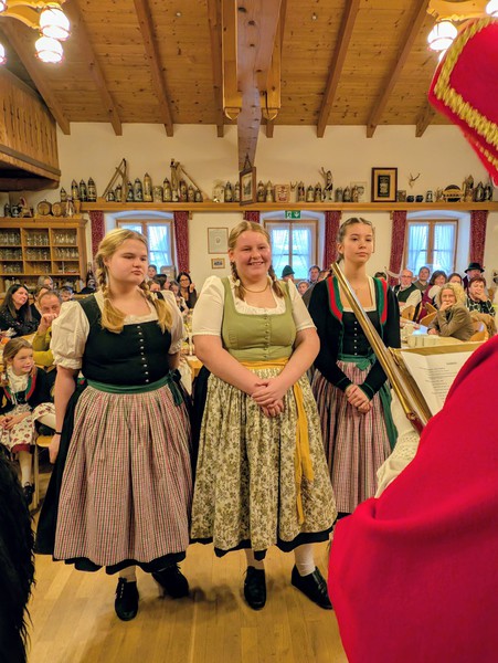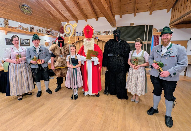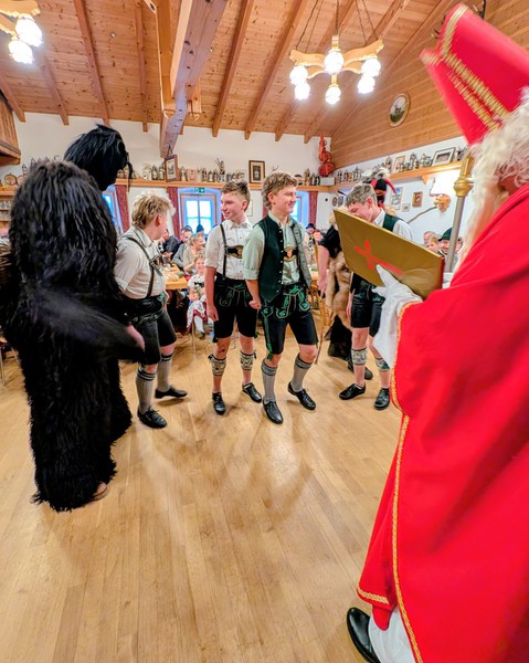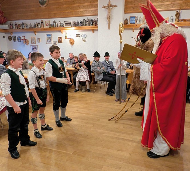 Noch der kurzen Dankesrunde hots dann gar nimma lang dauert bis da Hl. Nikolaus mit seinen zwoa dunklen Weggefährten zu uns aß Vereinsheim einagschaud hot. Er hot gmoand, dass a kead hot wia sich de Trachtenkinder droffa hamd und so woid da a eana an Bsuach abstatten. Da heilige Bsuach hot olle Kinder sehr gelobt, füa eanan Einsatz und für´s oiwei so brav do sei beim eigenen Fest heier im August. Zudem hot er sunst a nu ois gwusst wos so im ganzem Vereinsjahr los war. Und es war ja wirklich allerhand vui los heier hod a gmoand. A bissel ärgern hot ea sich miassn, dass seine Engerl vergessen ham die Platzierungen von den Kindern aufzuschreiben, die beim Gaujugendpreisplattln mitdo ham. Aber a do war Abhilfe schnell do, indem dass die Kinder eam des selber verraten ham. Für olle hot a, a schees Gschenkerl dabei kobt, wo´s die Buam und Dirndln gscheid gfreid hot.